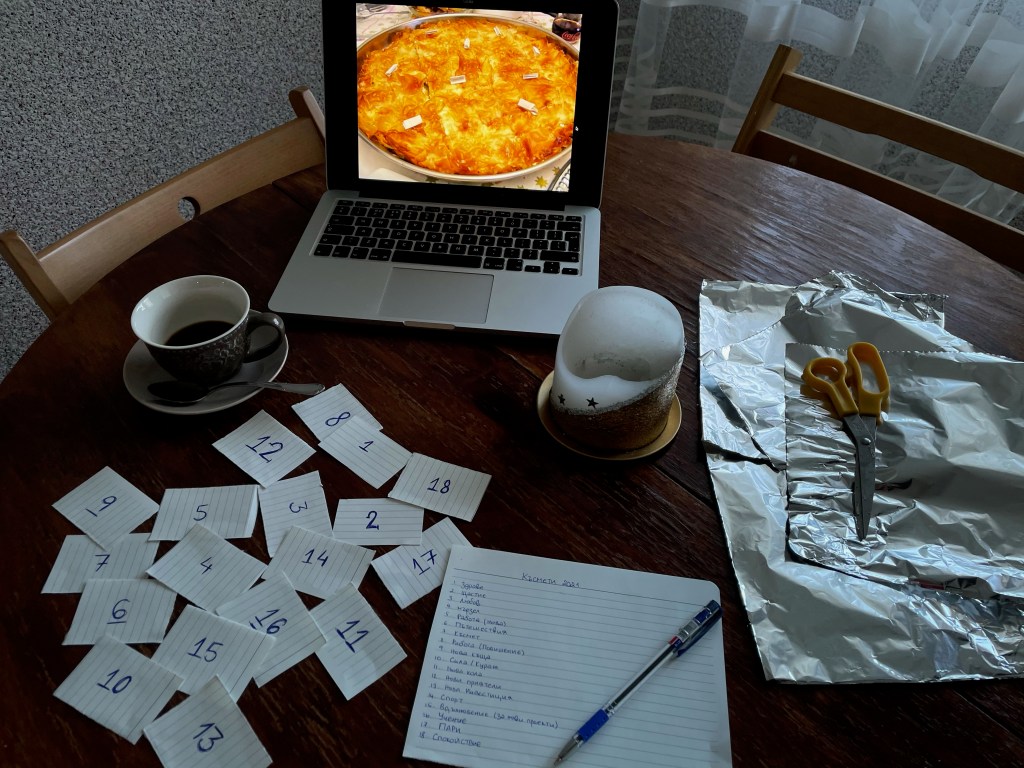 After the banitsa is cooked, everyone is served a piece with fortunes. Before (or while) eating, remove and unwrap the pieces of aluminium foil, read the number written on the paper, and find out which fortune it represents.