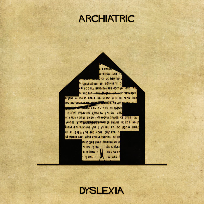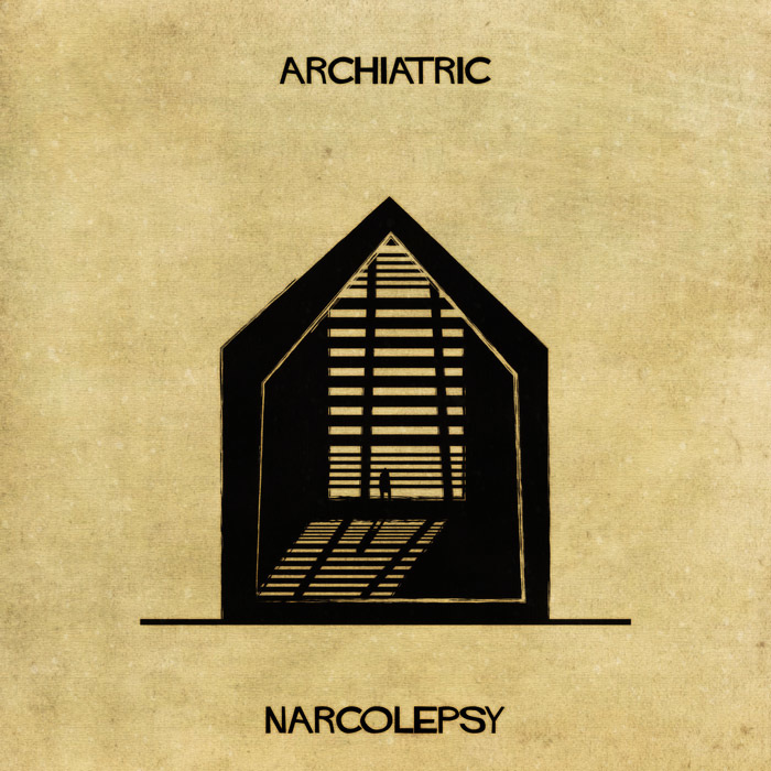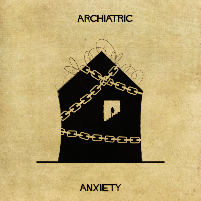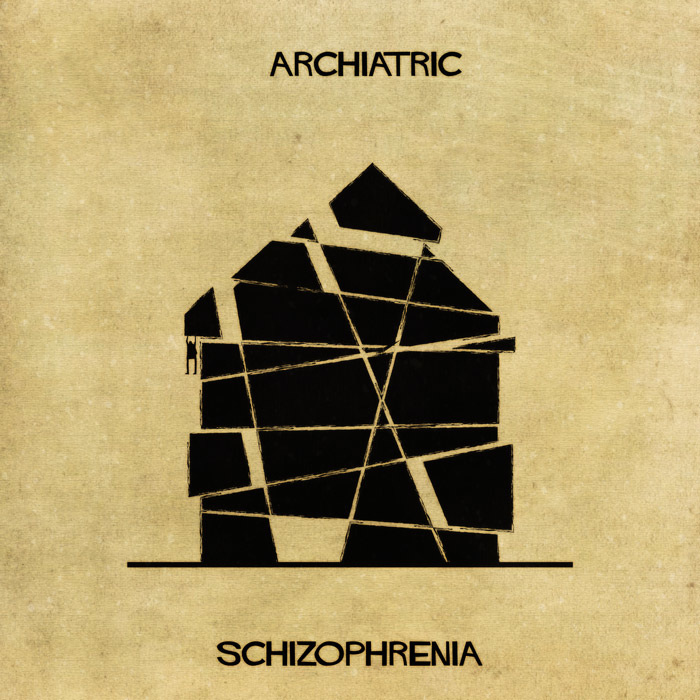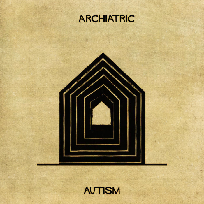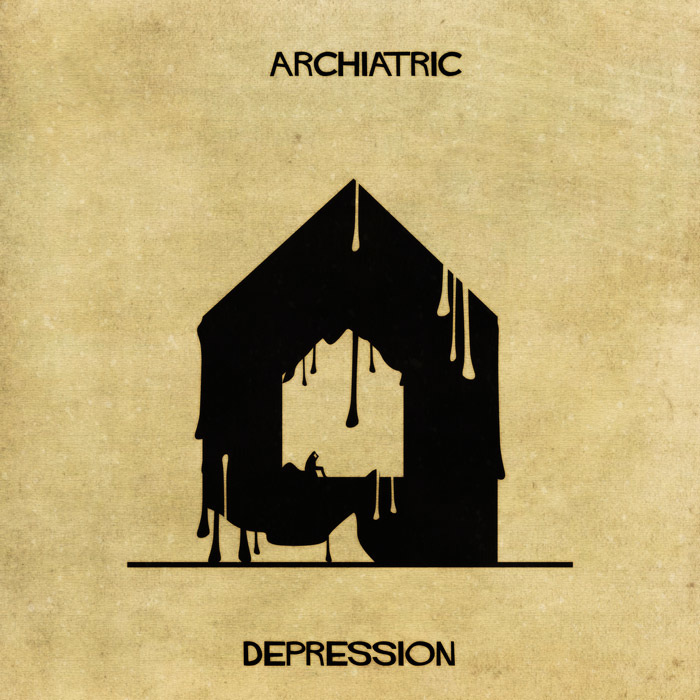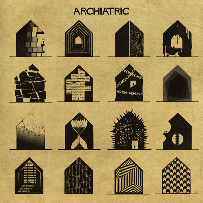 For all 16 illustrations in his ARCHIATRIC project, Babina uses the image of a house: a symbol for the bodies we call our homes. As seen in the animated video above, the artist initially depicts every mental disorder in the same way; that is, he begins with the image of a black house. He then manipulates this image and illustrates how each mental state affects this house (the body).