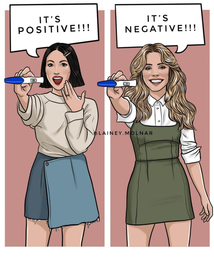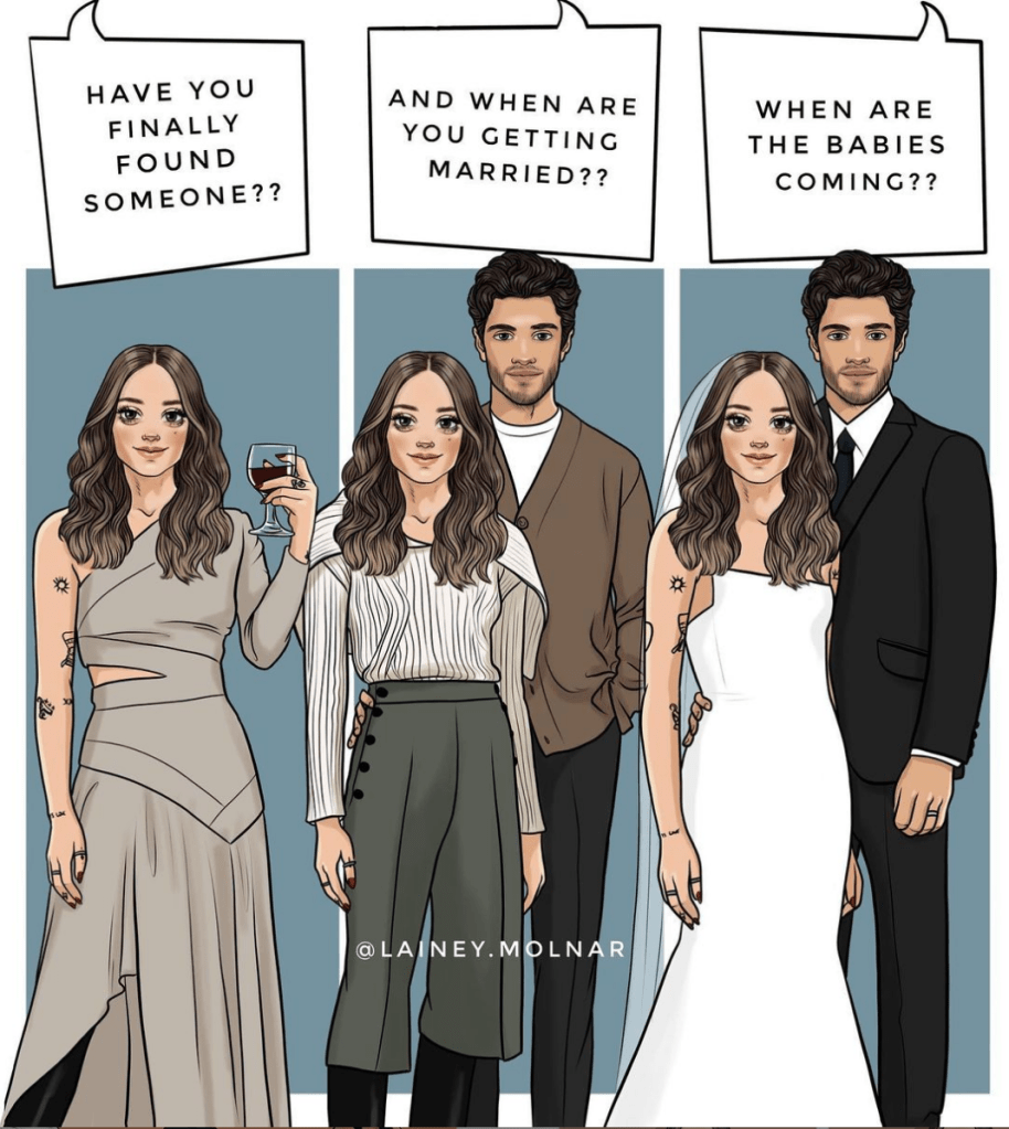In the illustration above, Molnar depicts two women under the same title: “An established and complete woman”. On the left side of the illustration, Molnar depicts a woman, her husband, and their child. On the right side, she draws a single woman with a glass of wine and a slice of pizza. Through this illustration, she aims to show that a woman can feel complete and established without being a mother and/or wife. While her work frequently comments on women’s right to remain childless and/or single if they wish to, Molnar’s work does not stop there.