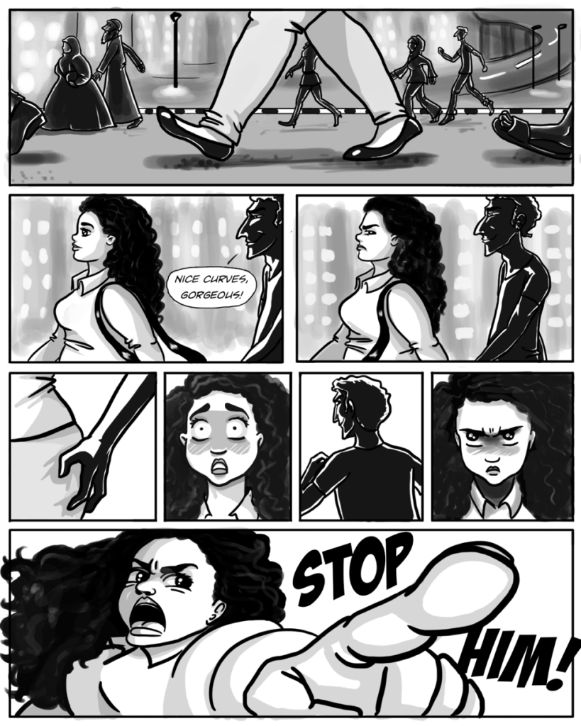 I believe this part of the comic is particularly important as it comes in response to those who claim women’s outfits are the reasons behind sexual harassment. Therefore, instead of blaming women, the assaulters must be punished. After this part, Mohamed wrote that “the majority of the themes in this comic are based on real experiences with street harassment.”