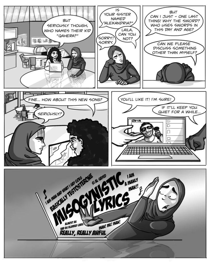 Qahera, the webcomic, also sheds light on how popular culture is misogynistic and depicts men as superior to women. In On Music (Sort Of), Qahera and Laila are bonding. Laila asks too many questions regarding her superpowers and fight techniques and Qahera is not keen to discuss them. Laila plays music to lighten the mood, but the lyrics are misogynistic, with the singer calling himself “Si al Sayed”: a term that denotes lots of manliness.