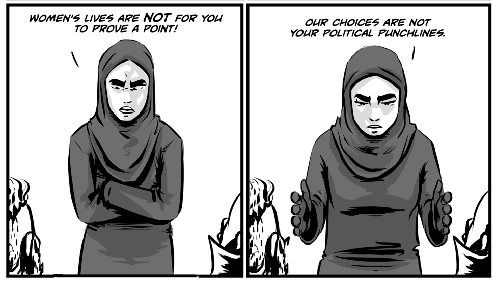 In the comic, when the protesters see Qahera, they chant that they should help her and that her eyes are begging for help. In reality, a close-up reveals that her eyes are filled with burning rage. They proceed to urge her to “Take off your oppression” while not respecting her choice and assuming every Muslimah[3] is oppressed and forced to wear a hijab. Qahera tells them that they have constantly undermined and ignored women and that Muslim women do not need their help.
